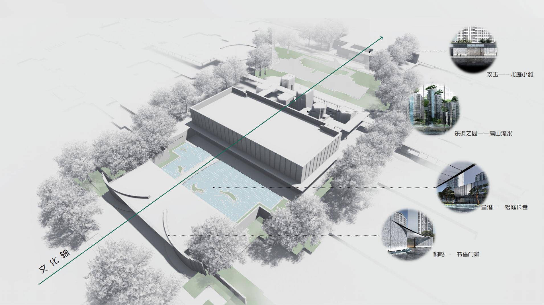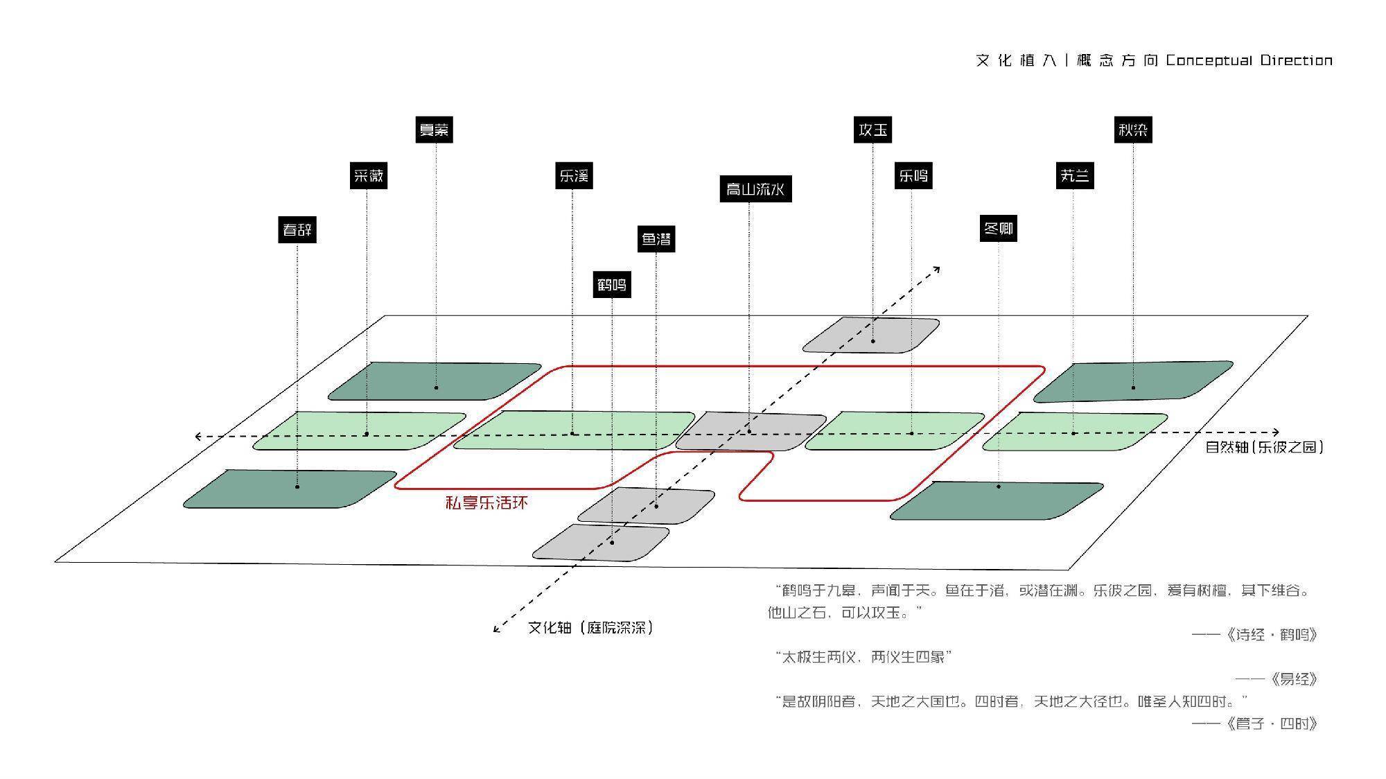社区园林从《诗经·鹤鸣》中“乐彼之园”获取灵感,以现代化建筑理念为骨,东方诗意美学为魂,把人居需求作为出发点,通过打造一环、两轴、四庭的社区园林结构,将东方的审美意识进行现代手法的演绎,并通过解决社区的功能痛点问题,打破人与人之间的沟通壁垒。